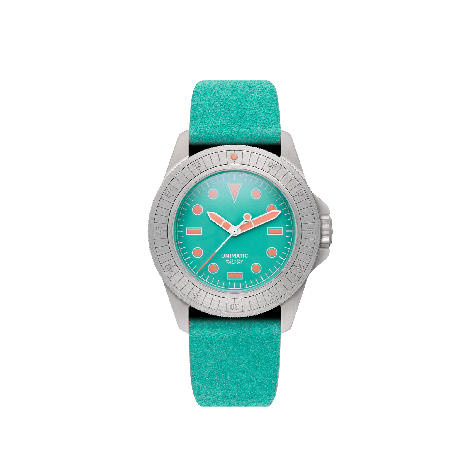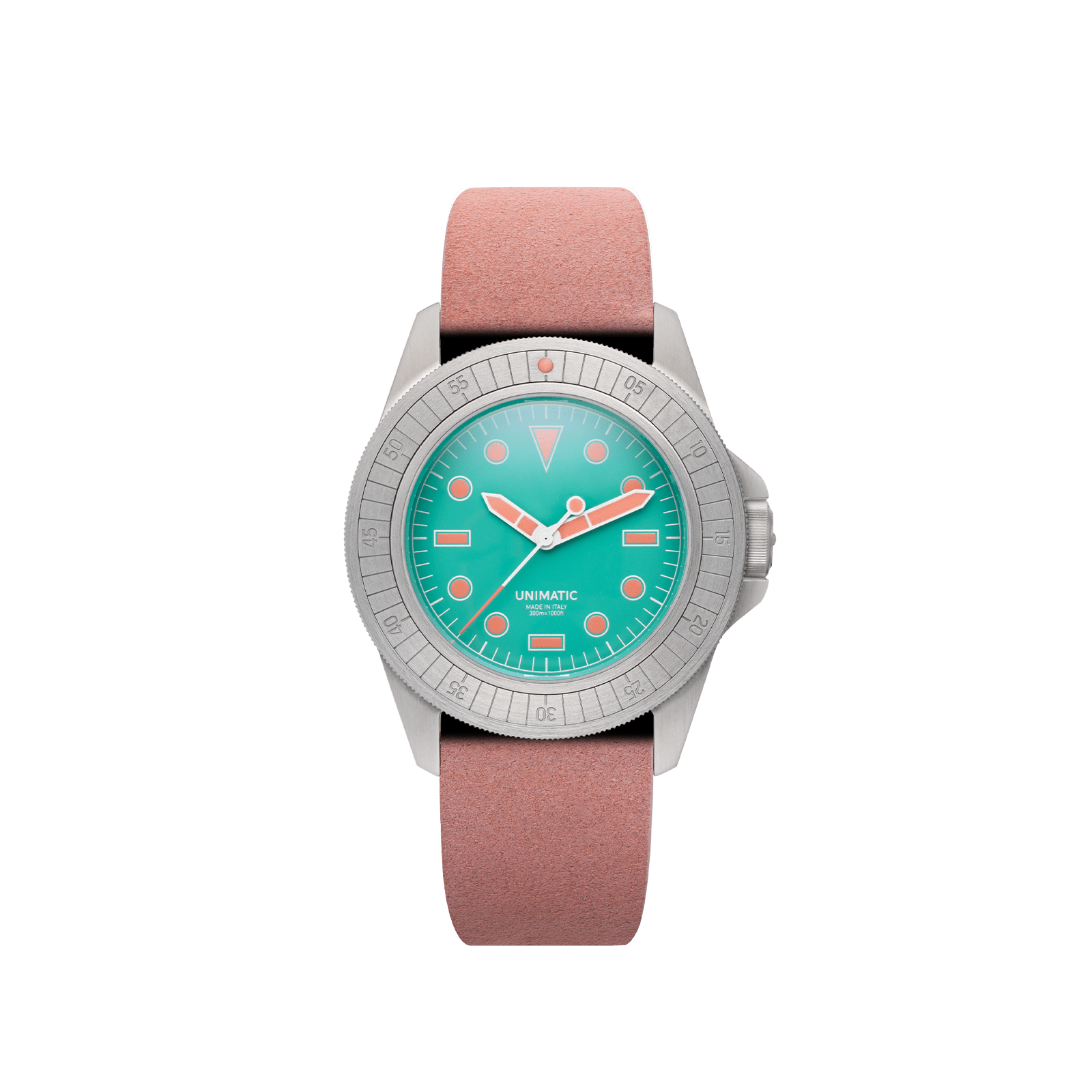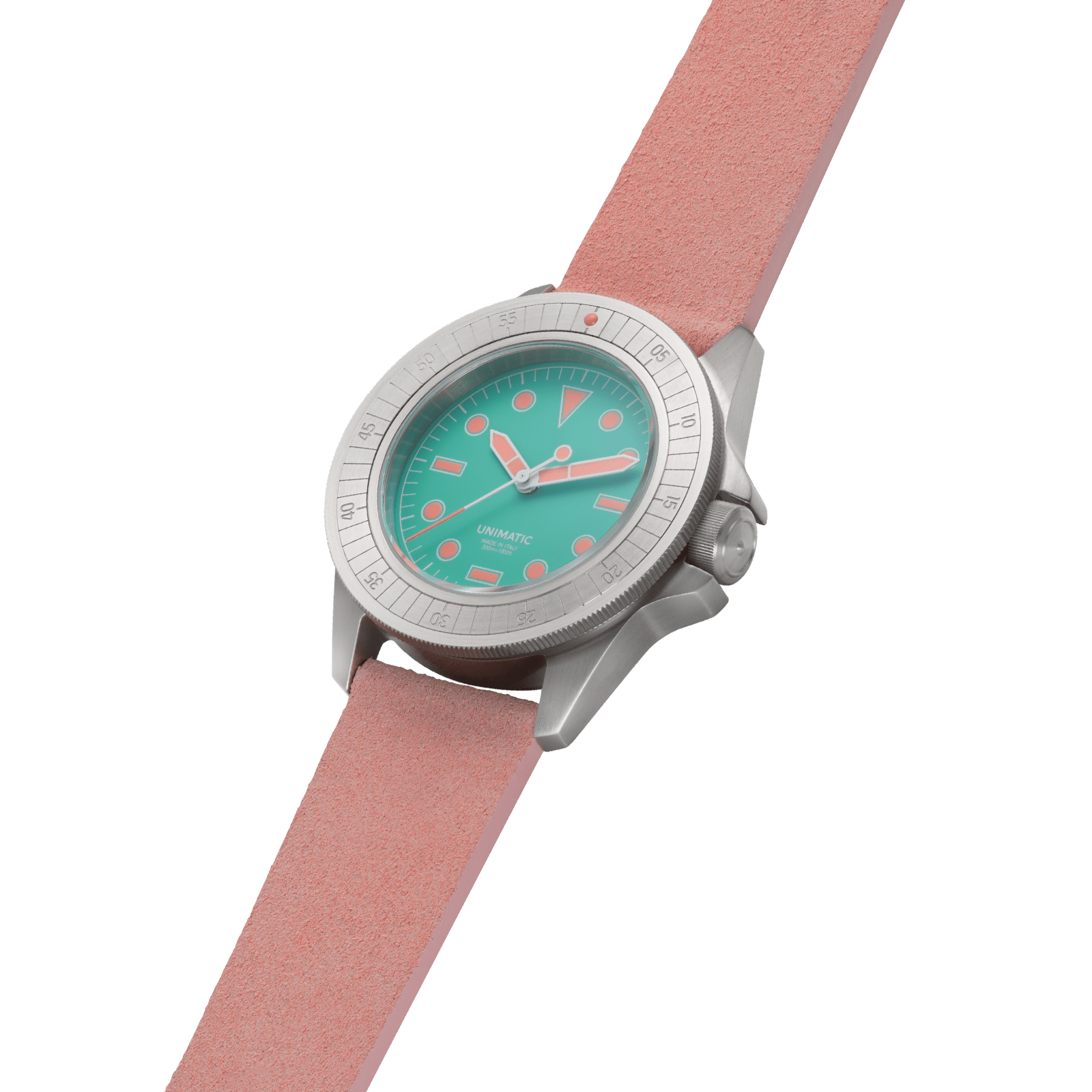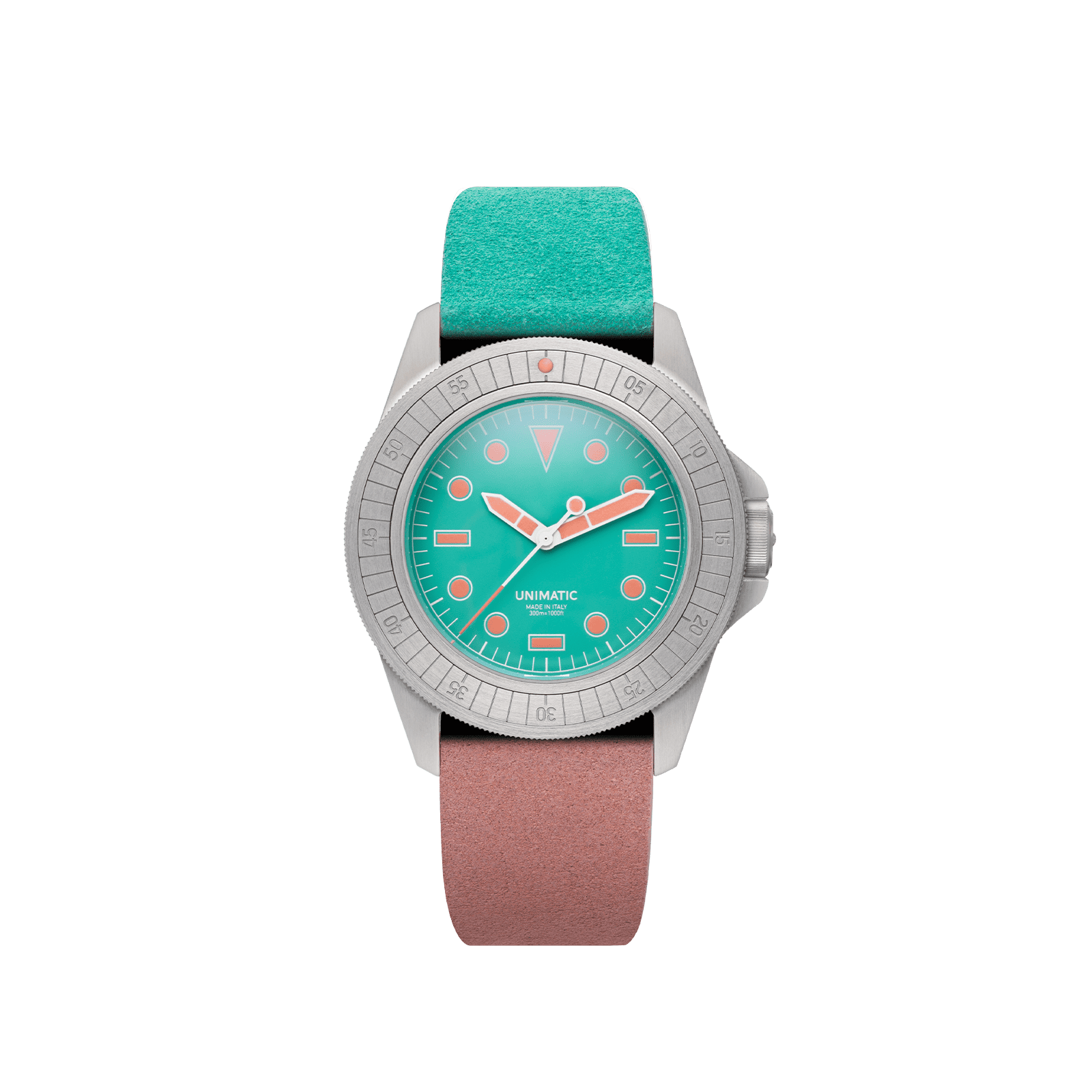 - Each watch comes with two colorful suede quick-release straps — one in verde acqua and one in blush pink — both with RIOCAM lining and brushed stainless steel hardware signed UNIMATIC.