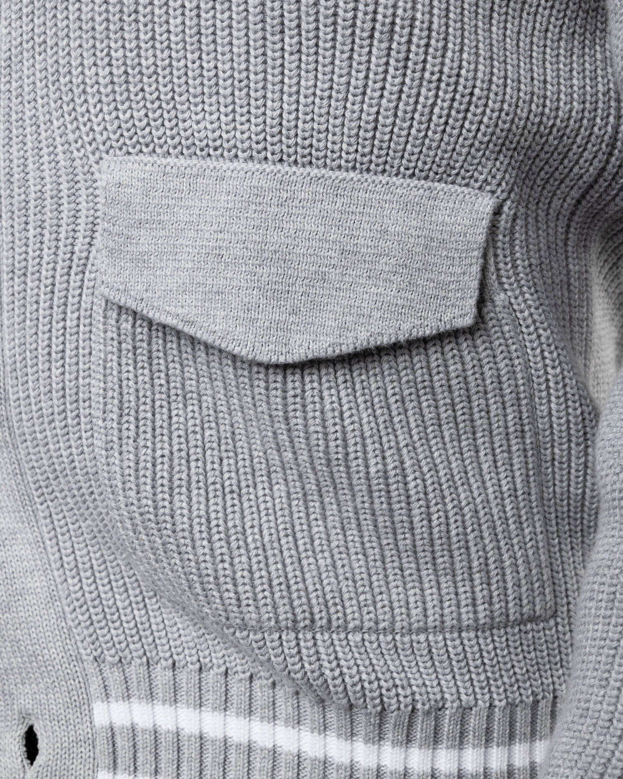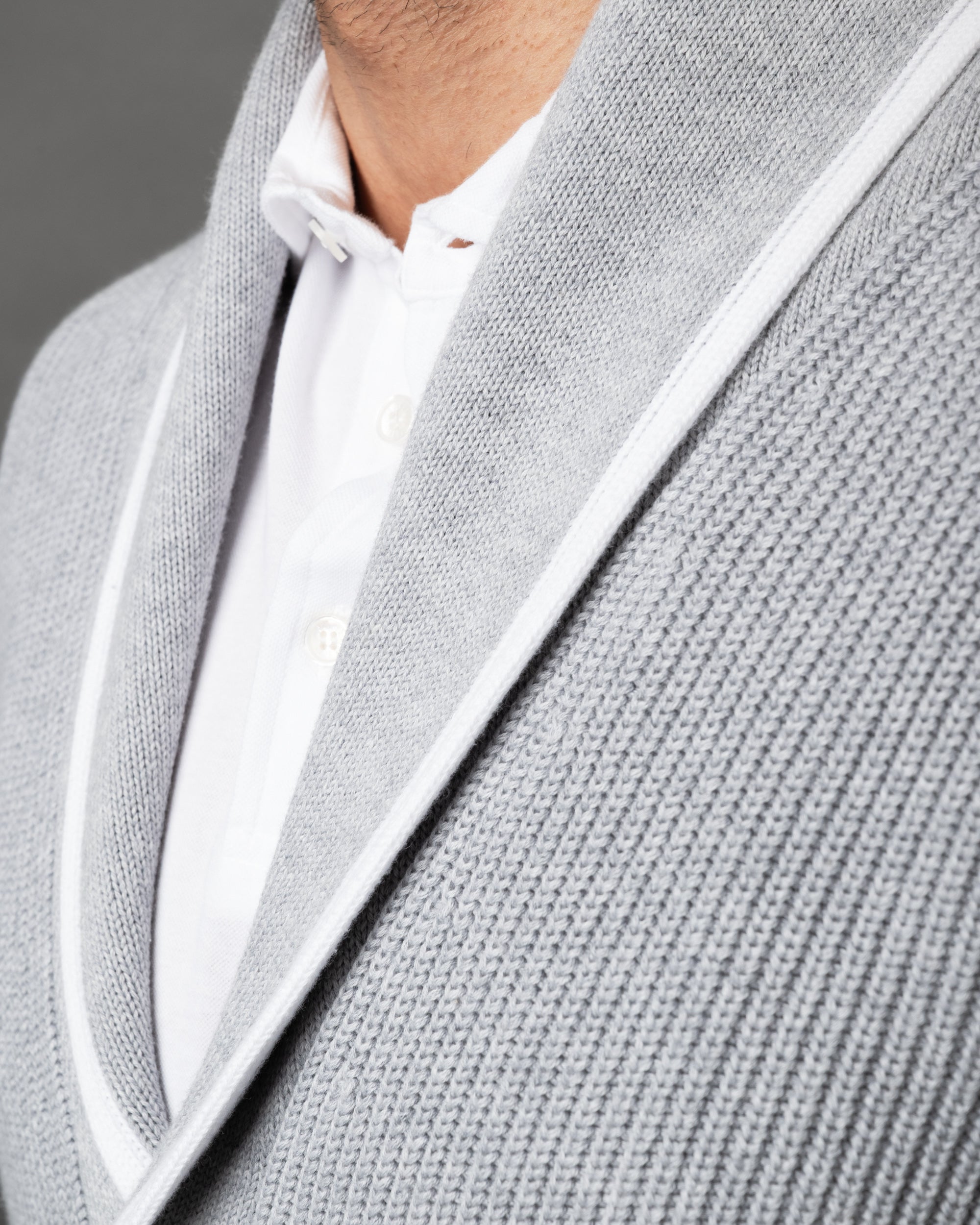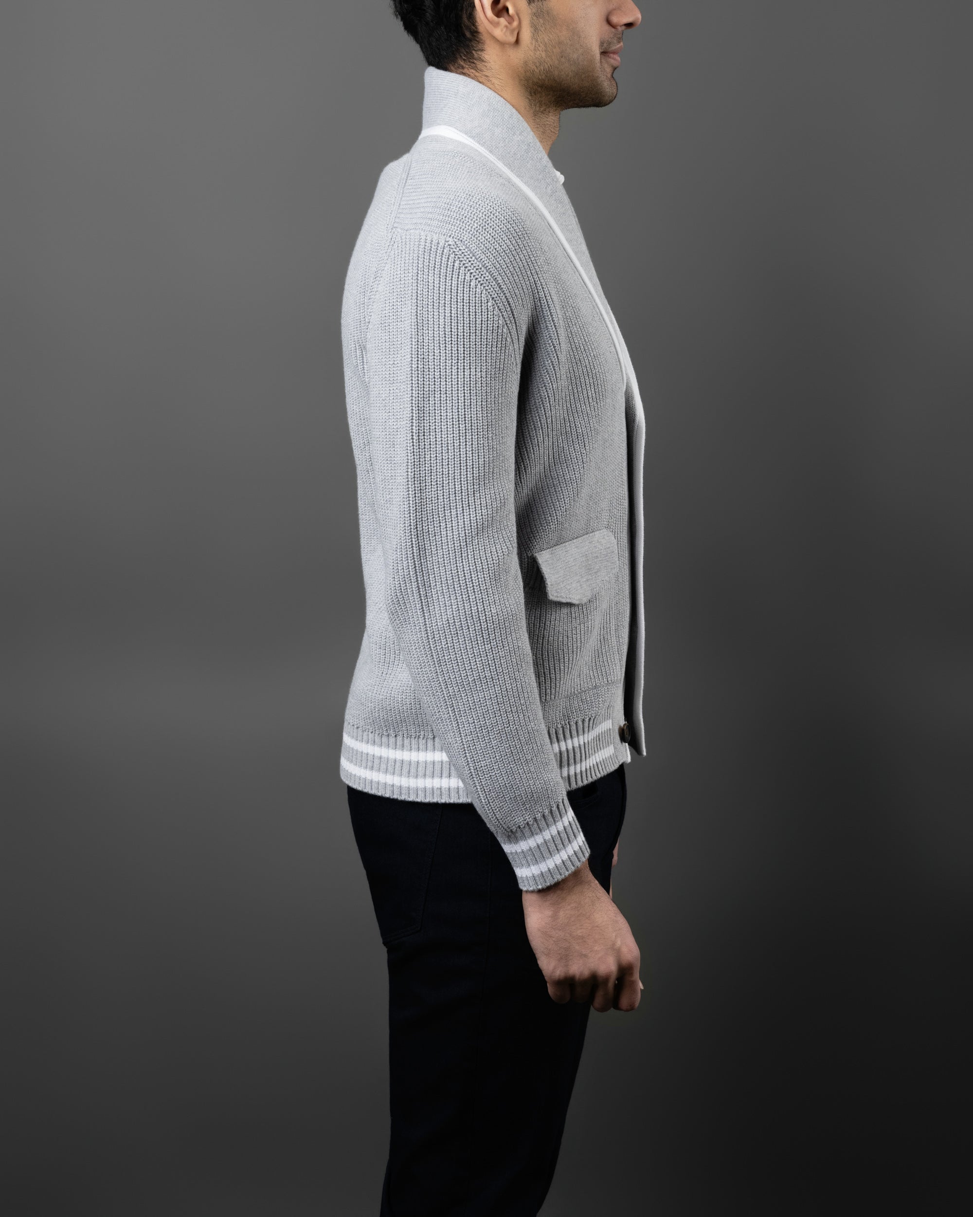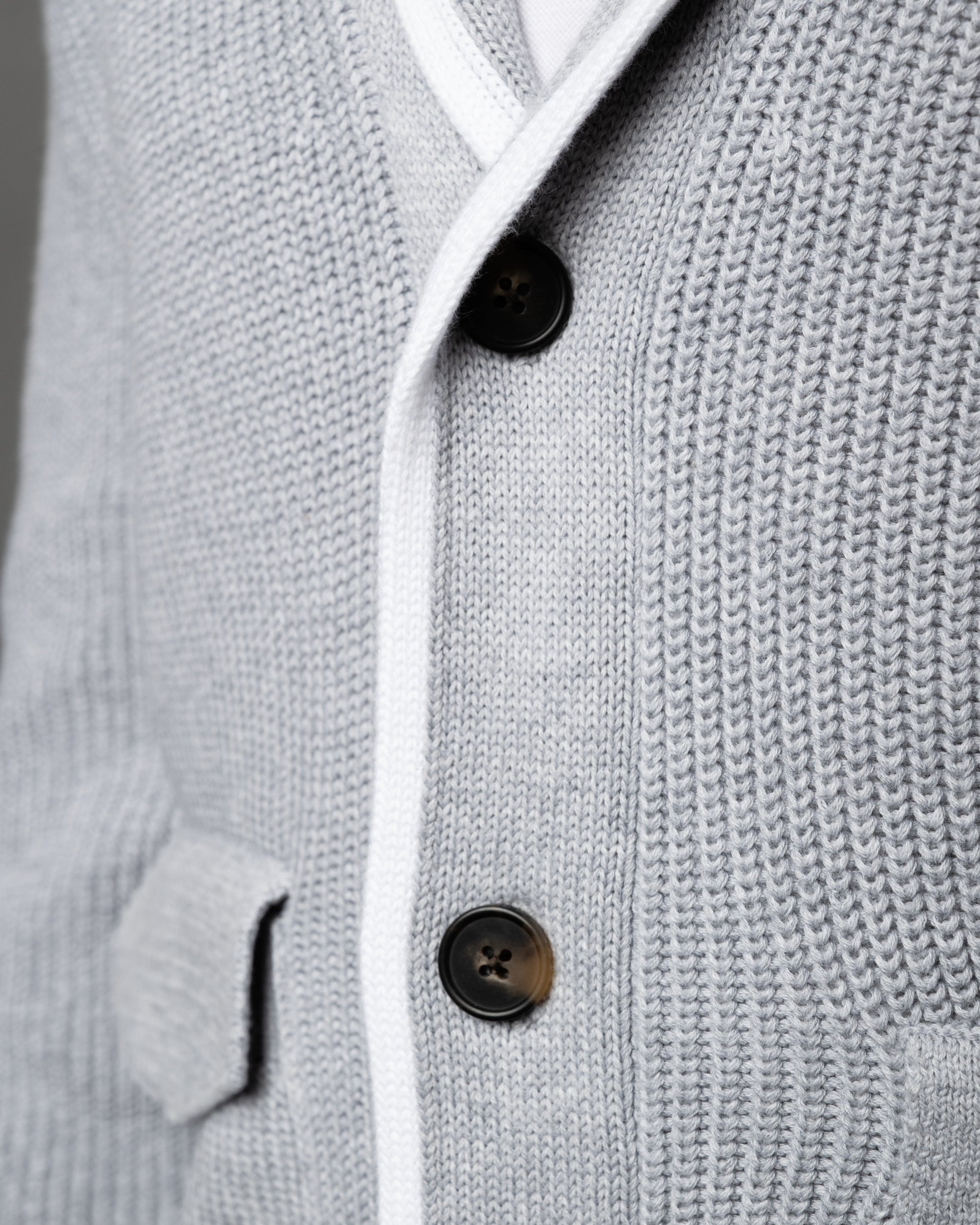 - The tactile texture of English rib stitch defines this shawl collar cardigan