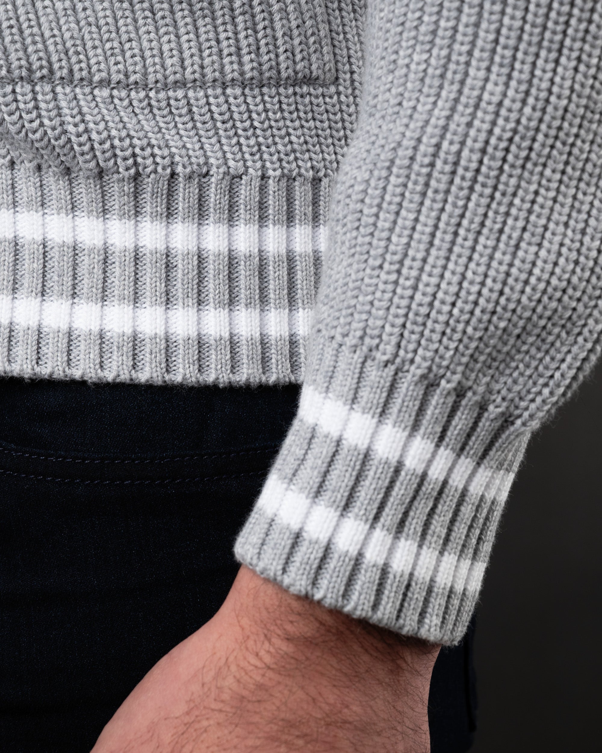 - Contrasting white stripes on the cuffs and hem
